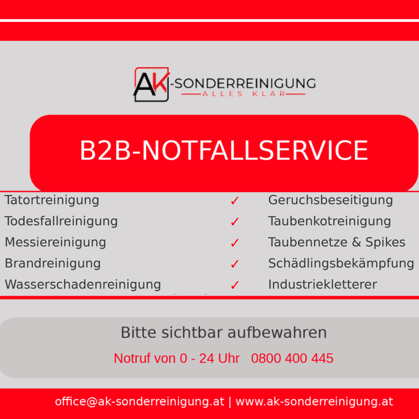 Der B2B-Notfallservice von AK-Sonderreinigung umfasst unter anderem Tatortreinigung, Messiereinigung, Brandreinigung, Wasserschadenreinigung, Geruchsbeseitigung, Taubenkotreinigung, Schädlingsbekämpfung und Einsätze mit Industriekletterern.